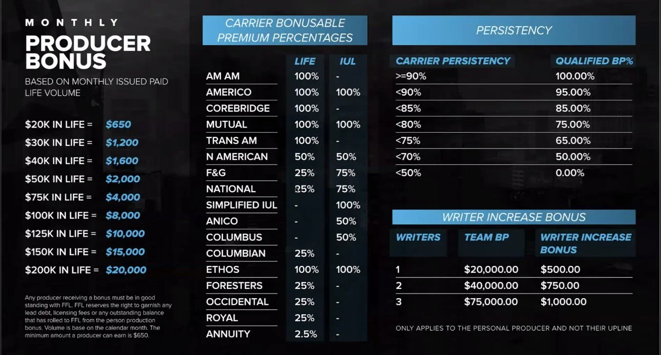 Monthly producer bonus checks are a minimum of $650 (after $20,000 plus issue paid production each month)